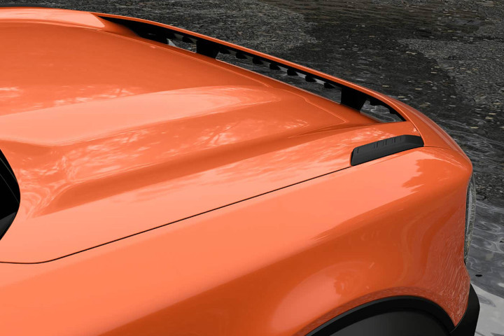车身周围用未上漆的塑料制成宽大的装饰条,包括车轮拱上的扩展装饰。前保险杠下部设有进气口,黑色顶上可以看到集成在前部的激光雷达,侧翼上设有可伸缩的门把手,车头被装饰条和行李箱门上的垂直把手“装点”,两侧垂直的灯具。